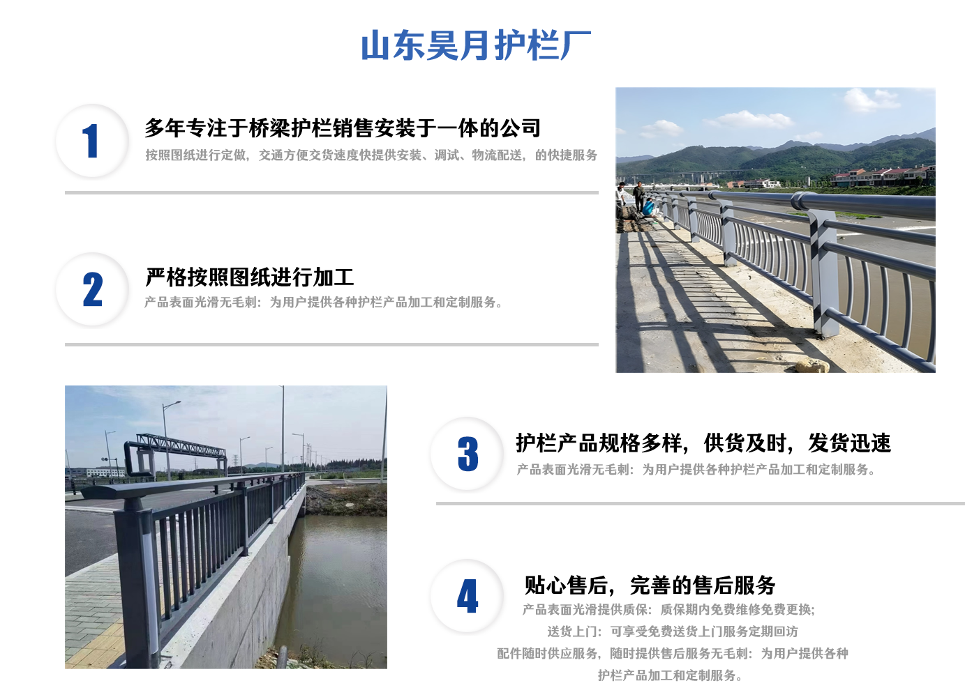 Company Profile山東昊月金屬制品有限公司坐落于原材料豐富人文和諧交通發(fā)達及有“江北水城”之稱——聊城。 公司以科技興廠為宗旨,積極引進人才和技術(shù),不斷開拓創(chuàng)新. 主營產(chǎn)品:SS級橋梁防撞護欄,不銹鋼復(fù)合管護欄,鋁合金護欄,燈光護欄,河道護欄等等。產(chǎn)品本公司建立了一套科學的行之有效的質(zhì)量體系,擁有一支高技術(shù)、高素質(zhì)團隊,堅持以“誠信”為本,堅持“優(yōu)質(zhì)的質(zhì)量、貼心的服務(wù)”為崇高理念,為用戶提供質(zhì)優(yōu)價廉的產(chǎn)品提供至真至誠的服務(wù)。與客戶合作雙贏、攜手共創(chuàng)輝煌。 公司以科學的工藝、嚴格的質(zhì)量管理、完善的服務(wù)理念、合理的銷售價格贏得了良好的聲譽,建立了密切和愉快的合作關(guān)系。多年來,我們一直以良好的品質(zhì)、合理的價格,完善的質(zhì)量保障體系,完善的售后服務(wù)為客戶提供周到的服務(wù),滿足廣大客戶的需求。 我們以信譽求生存,以質(zhì)量去競爭,以真誠換合作,以效益求發(fā)展,是我們的服務(wù)宗旨。我們積極主動與同行加強交流與時俱進,邁向新的歷程!我們竭誠歡迎您的咨詢和洽談,愿與同行業(yè)的同胞們合作共贏。...
